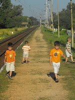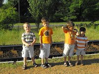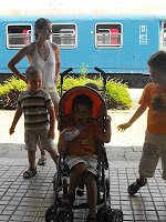 Kellemes szellő, a gyerekek élvzik – már látjuk az alagút végét! 20 perc alatt leértünk a végállomásra – azaz még van 40 percünk a vonatindulásig… Ebből 30-at simán eltöltöttünk egy vasúti átjáró mellett a félárnyékban nézelődve, figyelve a sípoló, zászlólengető vasutasokat, akik szorgalmasan irányítgattak ide-oda egy elkeveredett mozdonyt.:) Nem is akart Marci olyan sokszor átbújni a korláton a sínek közé, és a többiek sem sokszor estek le a korlátról.